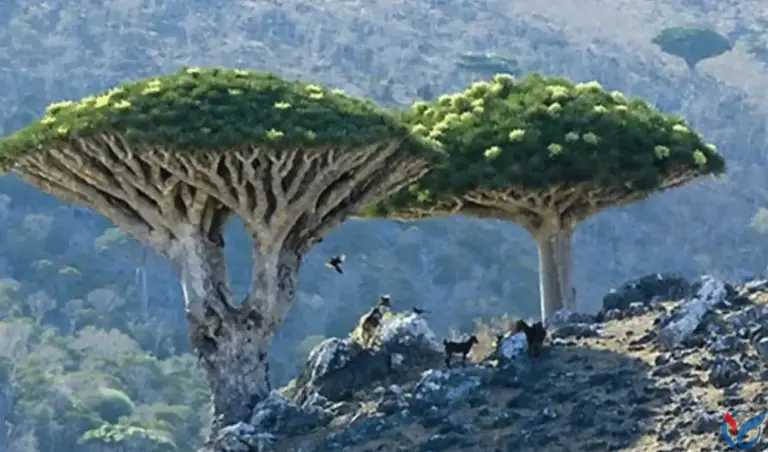 索科特拉岛上那种奇怪到离谱的“龙血树”: 树冠像大伞一样倒扣着, 砍一刀流红色汁液,像血。