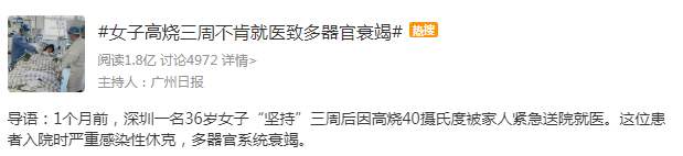 今早,“女子高烧三周不肯就医致多器官衰竭”话题冲上热搜。